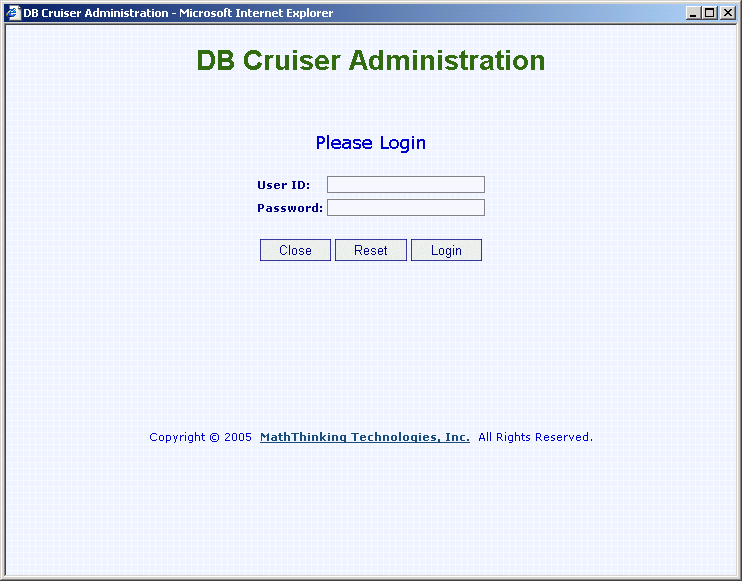 For example, you can turn debug on/off, add, delete and modify the connection list (the list shown on the login panel), etc. via the administration tool. See Administration Menu for the details. Best of all, any modification made by the administration tool will be taken into effect immediate , no server restart necessary - a MathThinking technology! The following screen shows the login panel of the administration tool, which can be accessed by clicking "Configuration" button on the Login Panel or on the left-hand Main Menu after login. |
